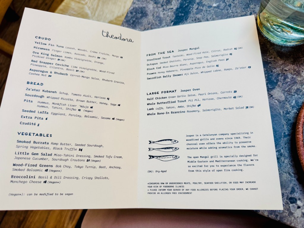 Theodora’s culinary concept is one that we personally love. The menu emphasizes dry-aged fish and meat prepared over an open flame and the blending of Mediterranean flavors with international influences. Most importantly, there is an emphasis on seasonal produce and the use of high quality ingredients.